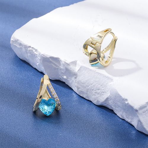 Gold Hoop Earrings with Blue Heart Gemstone and Clear Rhinestone Trim