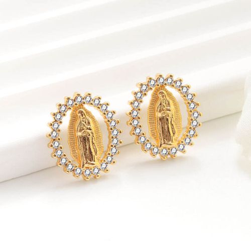 Gold Plated Virgin Mary Stud Earrings with Sparkling Crystal Surround